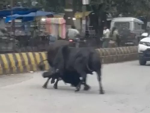 लड़ते समय दोनों सांड सड़क किनारे खड़ी कई वाहनों से टकरा गए। वाहन एक के बाद एक गिरते नजर आए। यह लड़ाई लगभग आधे घंटे तक चलती रही। स्थानीय दुकानदारों और राहगीरों ने उन्हें भगाने की कोशिश की, लेकिन वे लड़ते रहे।