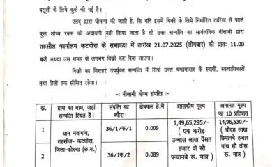 कोरबा/कटघोरा। छत्तीसगढ़ भू-राजस्व संहिता, 1959 की धारा 147 (ग) के अंतर्गत विमला देवी जायसवाल पति हरप्रसाद जायसवाल, ग्राम नवागांव, तहसील-कटघोरा, जिला – कोरबा (छ.ग.) के ख.नं....
