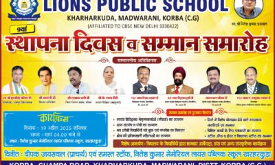 सम्मान समारोह का भी आयोजन कोरबा। ग्राम खरहरकुड़ा मड़वारानी में सीबीएसई मान्यता प्राप्त विद्यालय नितेश कुमार मेमोरियल लायंस पब्लिक स्कूल का 9वां स्थापना दिवस समारोह का...