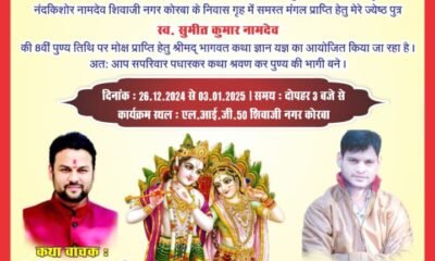 कोरबा। नामदेव परिवार द्वारा श्रीमद्भागवत कथा ज्ञानयज्ञ का आयोजन दिनांक 26 दिसंबर 2024 से 03 जनवरी 2025 तक किया जा रहा है। यह दिव्य कथा वाचन...