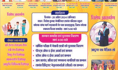 सम्मान समारोह के साथ-साथ वृहद चिकित्सा परामर्श कैम्पकोरबा (दिव्य आकाश)। कोरबा जिले के कोरबा-चाम्पा मार्ग पर स्थित मड़वारानी के पास खरहरकुड़ा में नितेश कुमार मेमोरियल लायंस...