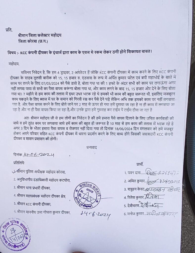 कलेक्टर को सौंपे ज्ञापन में पीडि़तों पवन दास, अमित कुमार, शत्रुहन केंवट, रितेश कुमार, देवीचरण एवं मनोज कुमार ने लिखा है कि केसीसी कंपनी के साहब तुलसी बारिक को एडवांस के रूप में 15-15 हजार दिए हैं। तुलसी बारिक के कहने पर उन्होंने अर्पित कुमार पटेल एवं बपी महाभोई के खाते में 15-15 हजार 07 मार्च 2024 को पैसे डाले और एक हफ्ते के अंदर काम दिलाने का वादा किया। दो महीने बीत जाने के बाद भी काम पर नहीं लगा और अब हमें घुमाया जा रहा है। उन्होंने कहा कि हम 10 माह से काम के लिए भटक रहे हैं और तीन दिन के अंदर काम न मिलने पर 18 जून को परिवार सहित केसीसी कंपनी दीपका में धरना प्रदर्शन करने पर मजबूर होंगे, जिसकी जवाबदारी कंपनी केसीसी दीपका एसईसीएल एवं शासन प्रशासन की होगी।