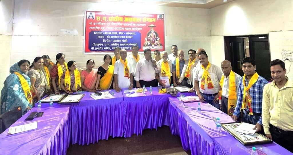 कोरबा । छत्तीसगढ़ प्रांतीय अग्रवाल संगठन के तत्वावधान में 23 जून 2025, सोमवार को श्री अग्रसेन भवन, कोरबा में एक भव्य कार्यक्रम का आयोजन किया गया। इस कार्यक्रम में भगवान श्री अग्रसेन जी के 18 गोत्रों के आधार पर 18 जिला आयोगों का गठन किया गया एवं संगठन के आजीवन एवं त्रैवार्षिक सदस्यों का सम्मान समारोह आयोजित किया गया।