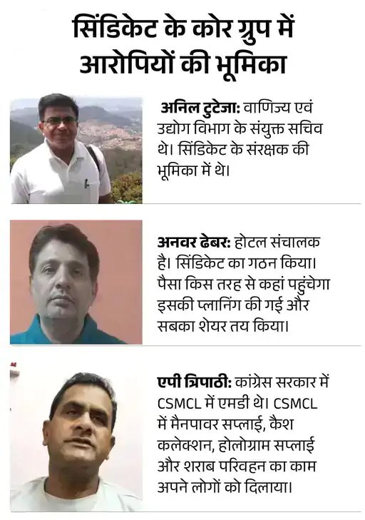 - एपी त्रिपाठी ने सिंडिकेट को शराब बिक्री का जोन अनुसार विश्लेषण मुहैया कराया था, ताकि क्षेत्र को कम-ज्यादा करके पैसा वसूल किया जा सके। इस प्रक्रिया को करके सिंडिकेट डिस्टलरी से कमीशन लेने लगा।