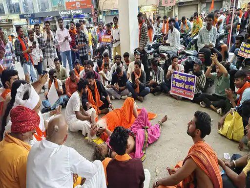छत्तीसगढ़ मॉब लिंचिंग…बारिश में साधु-संत सड़क पर लेटे:आरोपियों की गिरफ्तारी के विरोध में बजरंगियों ने घेरी कोतवाली; हनुमान चालीसा का कर रहे पाठ