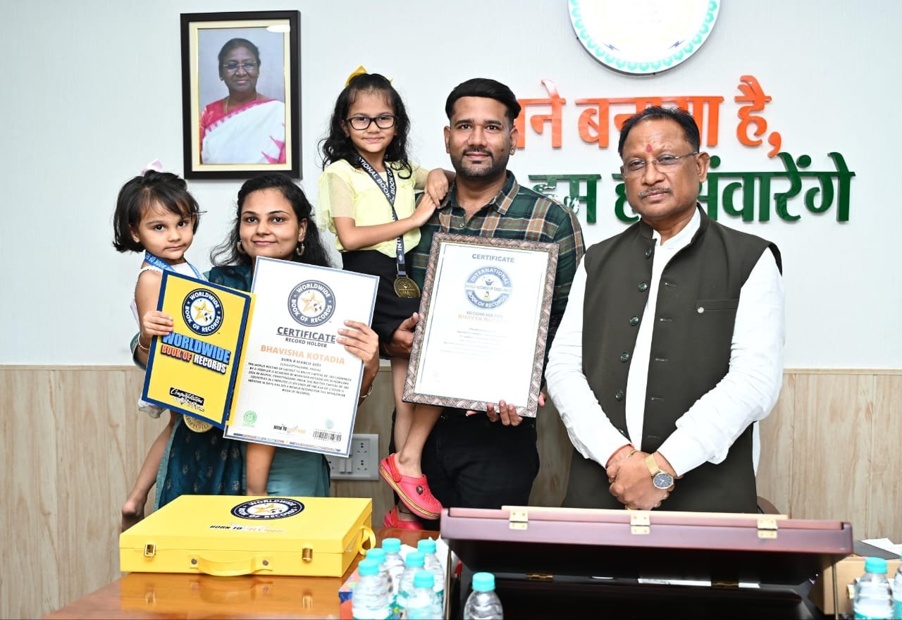 रायपुर । मुख्यमंत्री विष्णु देव साय से आज उनके निवास कार्यालय में 6 वर्षीय भव्या और 3 वर्षीय भविषा कोटडिया अपने माता-पिता के साथ मुलाकात की। भव्या को अविष्कारकों के नाम और 3 वर्षीय भविषा को 100 देश की राजधानियों के नाम कंठस्थ है। भव्या के नाम आविष्कारों के नाम सुनकर उनके अविष्कारकों का नाम सबसे तेजी से बताने का वर्ल्ड रिकॉर्ड ऑफ़ एक्सीलेंस दर्ज है, भव्य ने 1 मिनट 35 सेकंड में 50 अविष्कारकों के नाम बताकर यह उपलब्धि हासिल की है। इसी तरह भविषा के नाम 2 मिनट 21 सेकंड में 100 देश की राजधानियों के नाम बताने का रिकॉर्ड वर्ल्डवाइड बुक ऑफ़ रिकार्ड्स में दर्ज है। मुख्यमंत्री विष्णु देव साय ने इन नन्ही बेटियों की इतनी छोटी उम्र में मिली इस बड़ी उपलब्धि के लिए उनकी भूरी-भूरी प्रशंसा की और उनके उज्जवल भविष्य के लिए आशीर्वाद प्रदान किया। इन बच्चियों के पिता गौरव कोटडिया ने मुख्यमंत्री साय को अपनी बेटियों की उपलब्धियां की जानकारी देते हुए उनके प्रमाण पत्र और मेडल दिखाएं। इस अवसर पर बच्चियों की माता श्रीमती नमिता कोटडिया भी उपस्थित थीं।