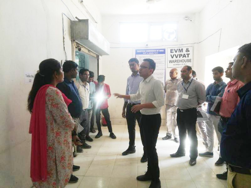 कोरबा। आज प्रात: कलेक्टोरेट परिसर में स्थित ईव्हीएम वेयर हाउस में कलेक्टर एवं जिला निर्वाचन अधिकारी सौरभ कुमार ने ईव्हीएम मशीन, व्ही.व्ही.पेैट, मशीन के कमीशनिंग प्रक्रिया का निरीक्षण किया। इस दौरान कलेक्टर ने ईव्हीएम मशीनों को सुरक्षित रखने हेतु एहतियात बरतने, आईटी कॉलेज के स्ट्रांग रूम में सभी आवश्यक व्यवस्था करने के निर्देश संबंधित अधिकारियों को दिये। इस अवसर पर उप जिला निर्वाचन अधिकारी सुश्री सीमा पात्रे, डिप्टी कलेक्टर सरोज महिलांगे सहित निर्वाचन विभाग के अन्य अधिकारी-कर्मचारी उपस्थित थे।