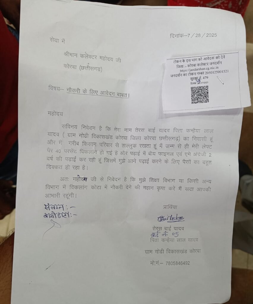 कोरबा। आज सोमवार को कलेक्टर जनदर्शन में कई आवेदन आए। कलेक्टर जनदर्शन में एक दिव्यांग युवती भी कलेक्टर के पास पहुंची और नौकरी की गुहार लगाई। कोरबा जिले के ग्राम गोढ़ी की विकलांग युवती तेरस बाई यादव ने कलेक्टर कोरबा को एक आवेदन पत्र सौंपकर नौकरी की गुहार लगाई है।