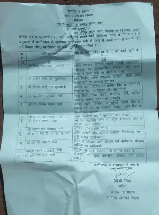 रायपुर, एजेंसी। छत्तीसगढ़ में मंत्रियों के विभाग तय हो गए हैं। इसे लेकर एक सूची भी वायरल हो रही है, लेकिन अभी तक विभागों को लेकर आधिकारिक रूप से पुष्टि नहीं हुई है। अफसरों का कहना है कि लिस्ट जल्द जारी हो सकती है। वहीं दूसरी ओर मंत्री भी इसे लेकर उलझन में हैं। उनके पास लोगों के बधाई देने के लिए कॉल आ रहे हैं, लेकिन उन्हें भी अभी इसके बारे में ऑफिशियल तौर पर नहीं बताया गया है। इससे पहले मुख्यमंत्री विष्णुदेव साय ने बंद लिफाफे में मंत्रियों के विभागों की लिस्ट गवर्नर हाउस भेजी थी। राज्यपाल ने लिस्ट में साइन कर सामान्य प्रशासन विभाग को भिजवा दिया था। प्रदेश में मंत्रियों के शपथ ग्रहण के 8 दिन बाद भी विभागों के बंटवारे का इंतजार था। साय कैबिनेट में किसी क्या जिम्मेदारी दी गई है, इसका अंतिम फैसला दिल्ली में ही हुआ है। गृहमंत्री अमित शाह इसकी मॉनिटरिंग कर रहे थे। इसे लेकर शपथ ग्रहण के अगले दिन 23 दिसंबर को सीएम साय ने पीएम नरेंद्र मोदी और केंद्रीय गृहमंत्री अमित शाह से मुलाकात की थी।