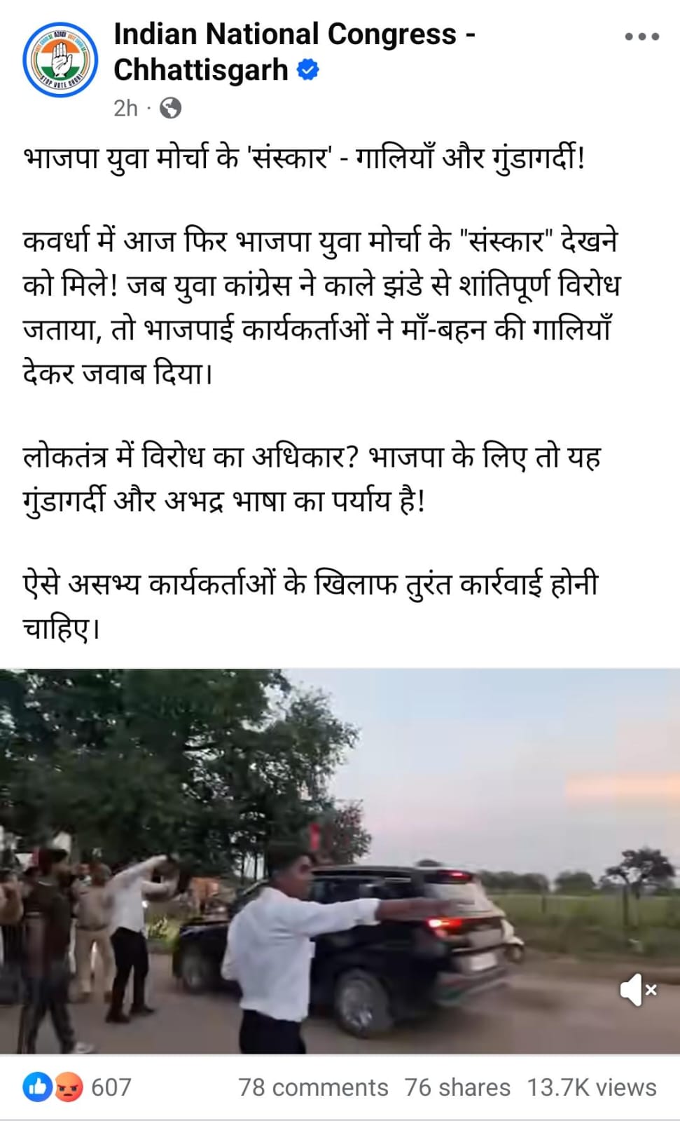 कांग्रेस ने वीडियो सोशल मीडिया में शेयर कर लिखा है कि ये भाजपा युवा मोर्चा के ‘संस्कार’ – गालियां और गुंडागर्दी! कवर्धा में आज फिर भाजपा युवा मोर्चा के “संस्कार” देखने को मिले! जब युवा कांग्रेस ने काले झंडे से शांतिपूर्ण विरोध जताया, तो भाजपाई कार्यकर्ताओं ने माँ-बहन की गालियाँ देकर जवाब दिया।