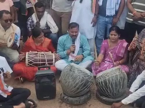 सड़क पर ढोलक-मंजीरा लेकर बैठे कांग्रेसी:खैरागढ़ में खराब सड़कों के विरोध में बजाए नगाड़े; अगली बार सरकारी दफ्तर में प्रदर्शन की चेतावनी