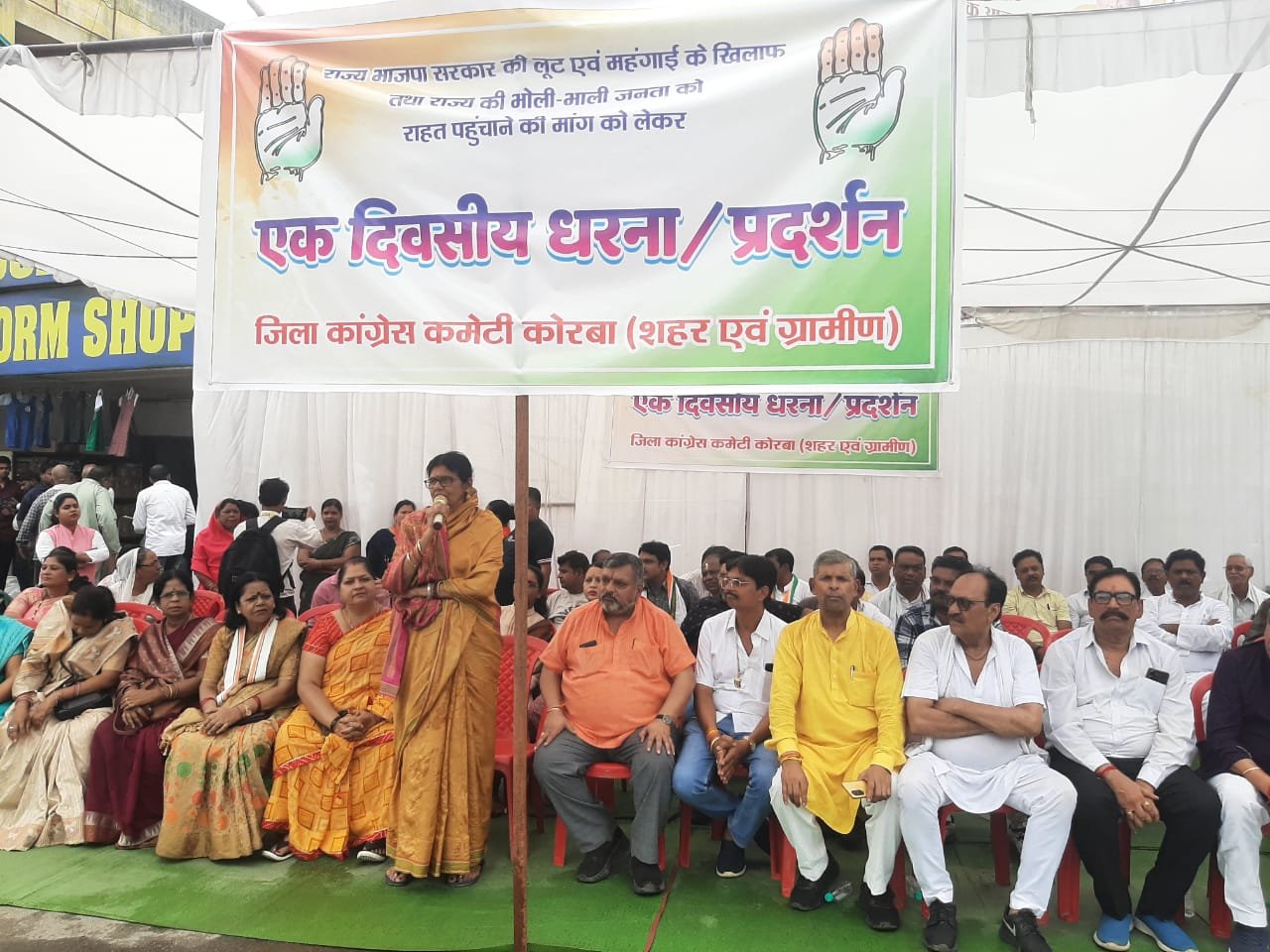 धरना प्रदर्शन को सम्बोधित करते हुए कोरबा सांसद श्रीमती ज्योत्सना चरणदास महंत ने कहा कि प्रदेश भर में सीमेंट को प्रति बोरी 50 रूपये के बढ़े हुए दाम में बेचा जा रहा है। प्रदेश की भाजपा सरकार आम जनता को लूटने में लगी है। प्रदेश की भाजपा सरकार का सीमेंट कंपनियों को संरक्षण प्राप्त है। श्रीमती महंत ने आगे कहा कि चुनाव जीतने के लिए महतारी योजना का लालच देकर महिलाओं को ठगा जा रहा है। प्रदेश में विष्णुदेव साय सरकार 9 माह में क्या कर रही है, कुछ पता नहीं चल रहा है। प्रदेश में स्कूल, सडक़, रेलवे की हालत खराब है। बेरोजगारी बढ़ी हुई है, महंगाई बेलगाम हो गई है। डबल इंजन की सरकार विकास का कार्य नहीं करा पा रही है।