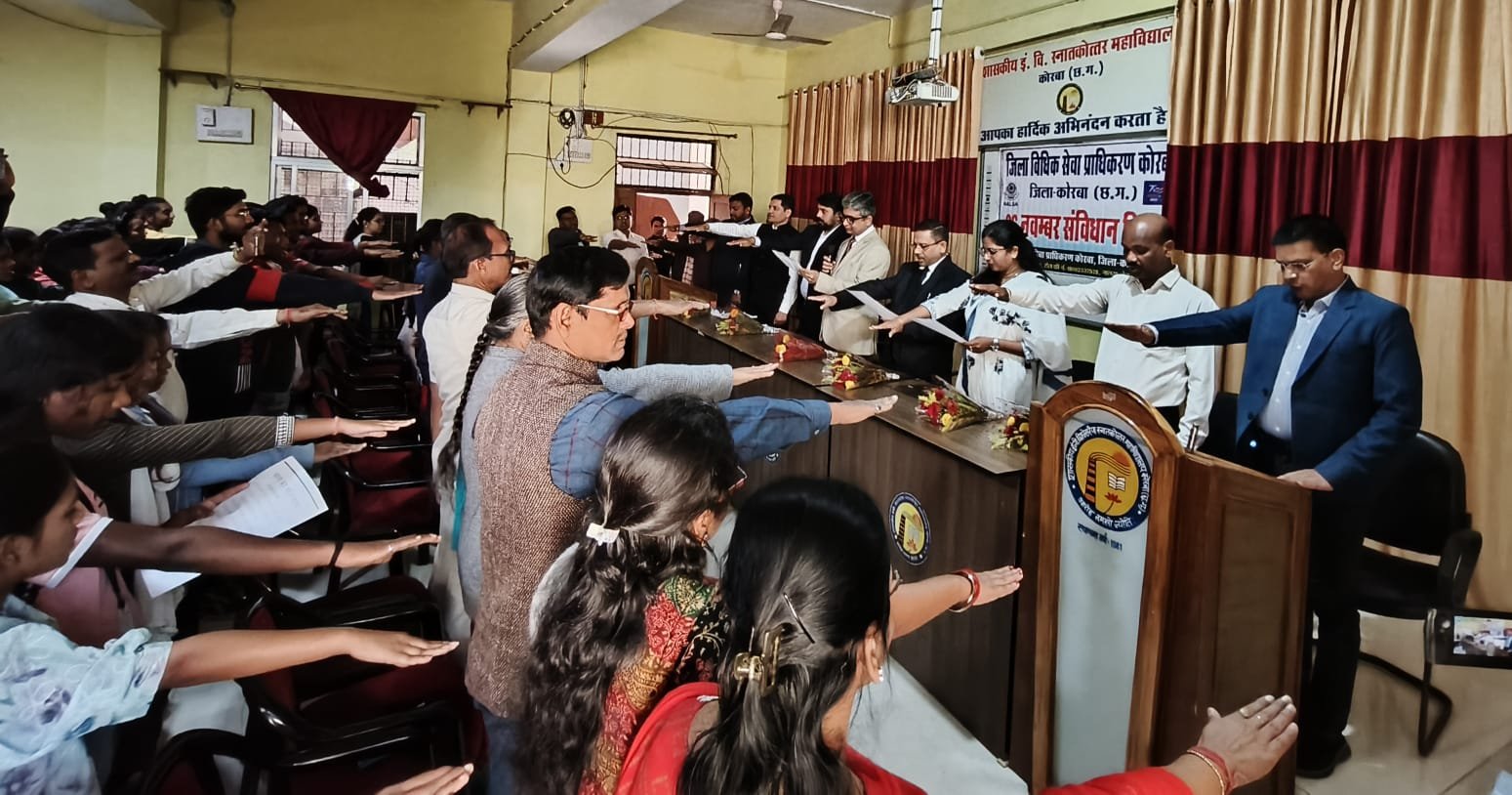 कोरबा। संविधान दिवस के अवसर पर विधिक जागरूकता कार्यक्रम का आयोजन शासकीय ई.व्ही. पी.जी. महाविद्यालय कोरबा में जिला विधिक सेवा प्राधिकरण कोरबा द्वारा किया गया। उक्त अवसर पर मुख्य अतिथि सत्येन्द्र कुमार साहू, प्रधान जिला एवं सत्र न्यायाधीश एवं अध्यक्ष जिला विधिक सेवा प्राधिकरण कोरबा के द्वारा अपने उद्बोधन में कहा गया कि इस सभा में सबसे अधिक छात्राएं अधिक संख्या में उपस्थित हंै। आज से 20 वर्षो पूर्व इतने छात्राएं उपस्थित नहीं हो पाते थे। आज यह तभी संभव हो पाया है हमारे संविधान के कारण। संविधान की उद्देशिका में समस्त नागरिकों को सामजिक, आर्थिक एवं राजनीतिक न्याय, विचार अभिव्यक्ति, धर्म, उपासना की स्वतंत्रता, निष्ठा एवं अवसर की समता प्रदान किया गया है। सभी व्यक्ति को गरिमा पूर्ण जीवन यापन करने का अधिकार दिया गया है। यह हमारा मानव अधिकार है। व्यक्ति की गरिमा के संबंध में संक्षिप्त उदाहरण देते हुये कहा गया कि कोई भी मनुष्य को हम दुखी अवस्था में देखते है तो हमेंं तकलीफ होती है। हम सब मनुष्य है। हमें मानवीय गरिमा से जीवन जीने का अधिकार है। लड़कियों को, गरीबों को आगे बढ़ाना है, बहुत से योजनाओं का लाभ हमें संविधान के द्वारा प्रदाय किया गया है। संविधान हमारे जीवन के प्रत्येक अंग से जुड़ा हुआ है। हमेंं हमेशा लीगल वे, सही रास्ता में चलना चाहिये। विधि है तो उपचार भी होगा। कानूनी उपचार लेना कठिन कार्य है। ये सभी हमारे संविधान में प्रावधानित है।