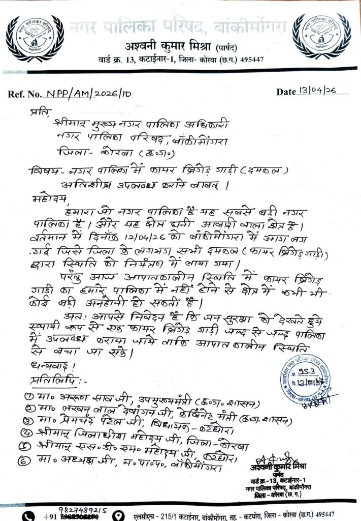 इसी विषय को गंभीरता से लेते हुए वार्ड क्रमांक 13 के पार्षद अश्वनी मिश्रा ने पूरे क्षेत्र के सुरक्षा के लिए नगर पालिका परिषद बांकी मोगरा के मुख्य अधिकारी को पत्र लिख कहा कि हमारा क्षेत्र एक बड़ी आबादी वाला क्षेत्र है और यहां एक भी अग्निशमन वाहन नहीं है। जिससे आगलगी की घटना होने पर जिला मुख्यालय से ही दमकल वाहन ही घटनास्थल पर पहुंचकर आग बुझाते हैं पर इनके आते आते घटनास्थल पर पूरी तरह से क्षति हो जाती है।