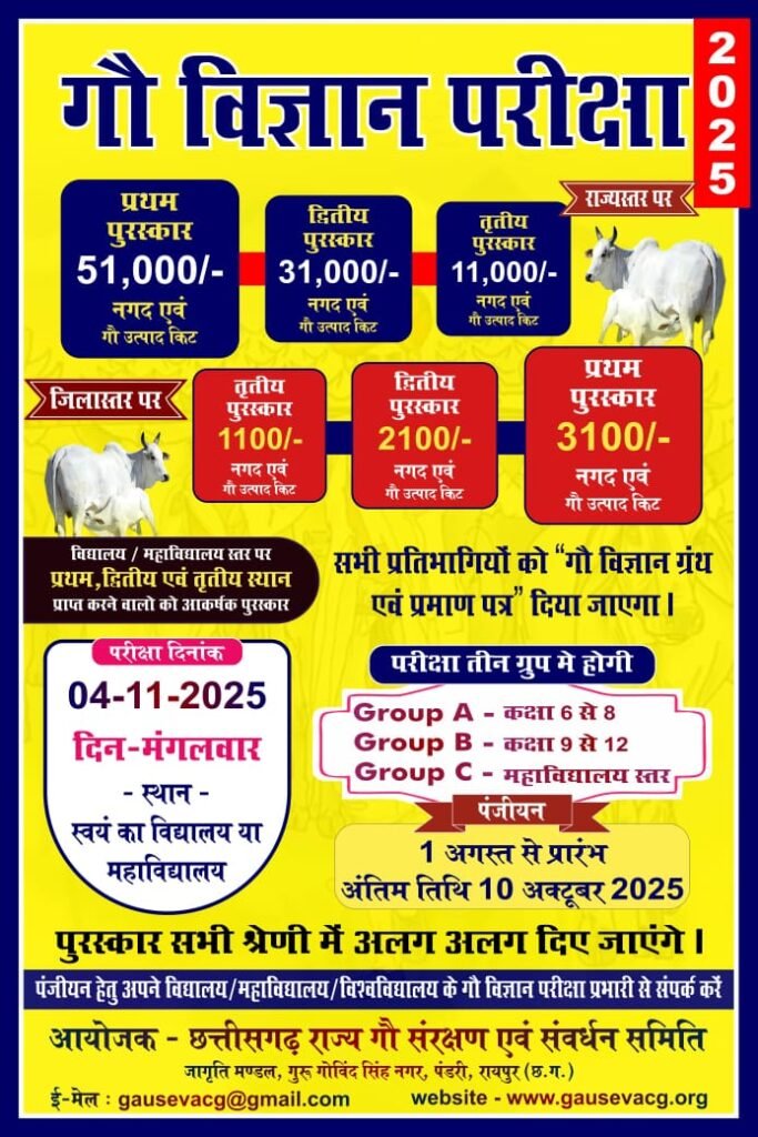 रायपुर/कोरबा/पाली। विगत वर्ष की भांति इस वर्ष भी अभी शासकीय,अशासकीय विद्यालय और महाविद्यालयों में गौ विज्ञान परीक्षा 4नवम्बर को आयोजित की जावेगी।लगभग 10,000 विद्यालयों एवं 1000 उच्च शिक्षण संस्थानो तक पहुंचने का लक्ष्य रखा गया है।