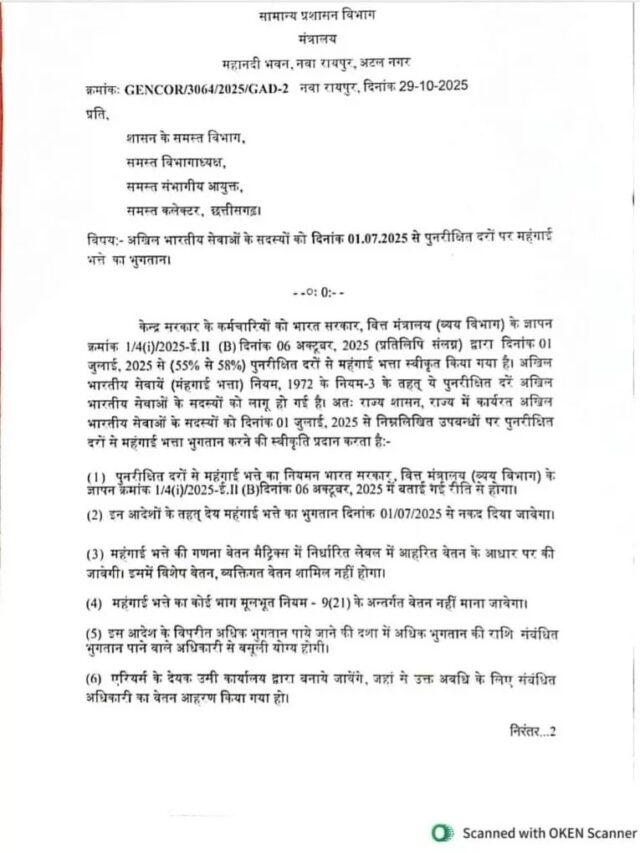 अखिल भारतीय सेवाएं (महंगाई भत्ता) नियम, 1972 के तहत अब यह बढ़ा हुआ महंगाई भत्ता IAS, IPS और IFS अधिकारियों पर भी लागू होगा। छत्तीसगढ़ सरकार ने नई दरों को मंजूरी दे दी है। इसके अनुसार राज्य में पदस्थ सभी अखिल भारतीय सेवा अधिकारी 1 जुलाई 2025 से नई दरों के अनुसार महंगाई भत्ता प्राप्त करेंगे।