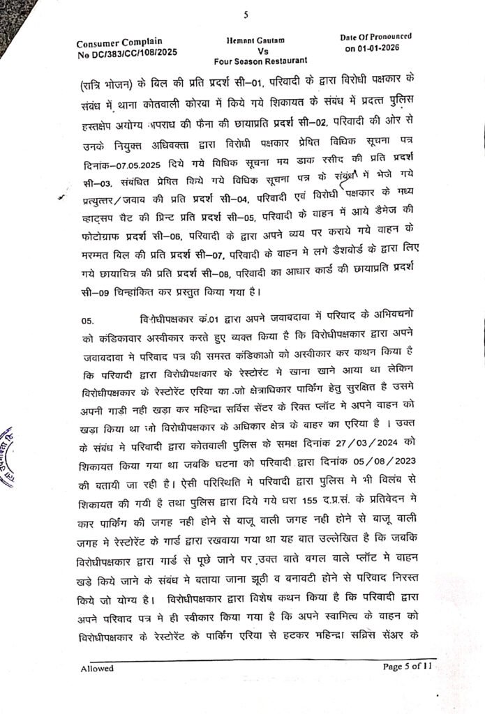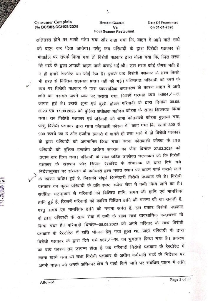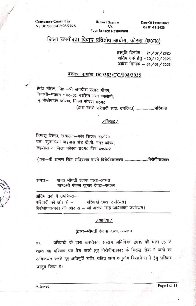 नरसिंग गंगा कालोनी, न्यू पोड़ीबहार कोरबा निवासी एवं अधिवक्ता हेमंत गौतम ने सुनालिया बाईपास रोड टीपी नगर में संचालित होटल फोर सिजन रेस्टोरेंट के विरुद्ध जिला उपभोक्ता विवाद प्रतितोष आयोग कोरबा में यह मामला दायर किया था। परिवादी श्री गौतम द्वारा उपभोक्ता संरक्षण अधिनियम 2019 की धारा 35 के तहत यह परिवाद पत्र पेश करते हुए विरोधीपक्षकार होटल संचालक हिमांशू सिन्हा के विरूद्ध सेवा में कमी का अभिकथन करते हुए क्षतिपूर्ति राशि, सहित अन्य अनुतोष दिलाए जाने हेतु परिवाद प्रस्तुत किया था।