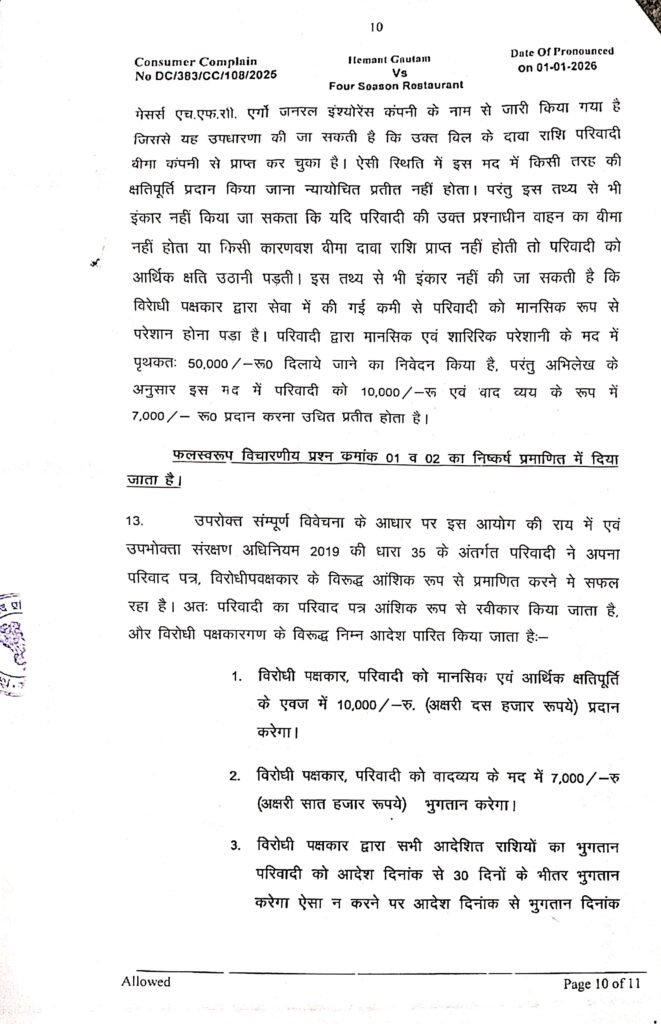 सेवा में कमी किए जाने से आहत परिवादी हेमंत गौतम ने जिला उपभोक्ता विवाद प्रतितोष आयोग के समक्ष परिवाद प्रस्तुत करते हुए न्याय की गुहार लगाई थी। संम्पूर्ण विवेचना के आधार पर अध्यक्ष जिला उपभोक्ता विवाद निवारण आयोग, कोरबा रंजना दत्ता एवं सदस्य पंकज कुमार देवड़ा द्वारा आदेश जारी कर होटल फोर सीजन के संचालक हिमांशू सिन्हा को 30 दिनों के भीतर क्षतिपूर्ति के एवज में 10,000 रुपए एवं वाद व्यय के रूप में 7,000 रुपए भुगतान करने के आदेश जारी किए हैं। ऐसा न करने पर आदेश दिनांक से भुगतान दिनांक तक 09 प्रतिशत वार्षिक की दर से ब्याज आदेशित राशि पर भुगतान करना होगा।