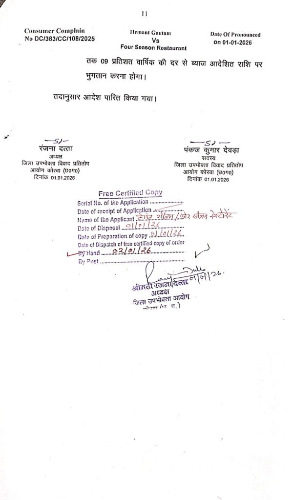 परिवादी एवं अधिवक्ता हेमंत गौतम के वाद पर जिला उपभोक्ता विवाद प्रतितोष आयोग कोरबा का फैसला