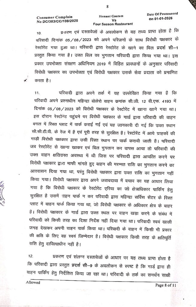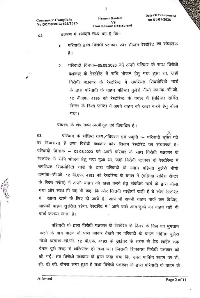 परिवादी हेमंत गौतम 5 अगस्त 2023 को अपने परिवार के साथ फोर सीजन रेस्टोरेंट में रात्रि भोजन के लिए गए हुए थे। रेस्टोरेन्ट में उपस्थित सिक्योरिटी गार्ड के कहने पर परिवादी ने अपना वाहन महिन्द्रा बुलेरो नीयो क्रमांक- सीजी 12 बीएफ 4193 को रेस्टोरेन्ट के बगल में (महिन्द्रा सर्विस सेन्टर के रिक्त प्लॉट) में अपने वाहन को खड़ा कर दिया गया। साथ ही गार्ड ने यह भी कहा कि और जितनी गाड़ियां खड़ी हैं, उसमें भी लोग रेस्टोरेंट खाना खाने के लिए ही आए हैं। आप भी अपना वाहन पार्क कर दीजिए, वाहन सुरक्षित रहेगा। रेस्टॉरेंट में आने वाले आगंतुकों का वाहन यहीं भी पार्क कराया जाता है।