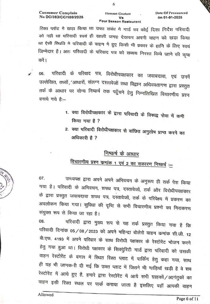 पर बाद में जब वाहन स्वामी और परिवादी हेमंत गौतम ने होटल संचालक से मोबाइल पर संपर्क किया गया तो उन्होंने किसी भी प्रकार के सहयोग से स्पष्ट इंकार कर दिया। साथ ही कहा कि जिस तरफ रेस्टोरेंट के गार्ड द्वारा वाहन पार्क कराया गया था, वहां कोई कैमरा नहीं है। होटल संचालक ने किसी भी तरह से वित्तीय सहायता प्रदान नहीं की। आखिरकार श्री गौतम ने स्वयं के व्यय पर अपने वाहन में आई क्षति का मरम्मत के कराया।