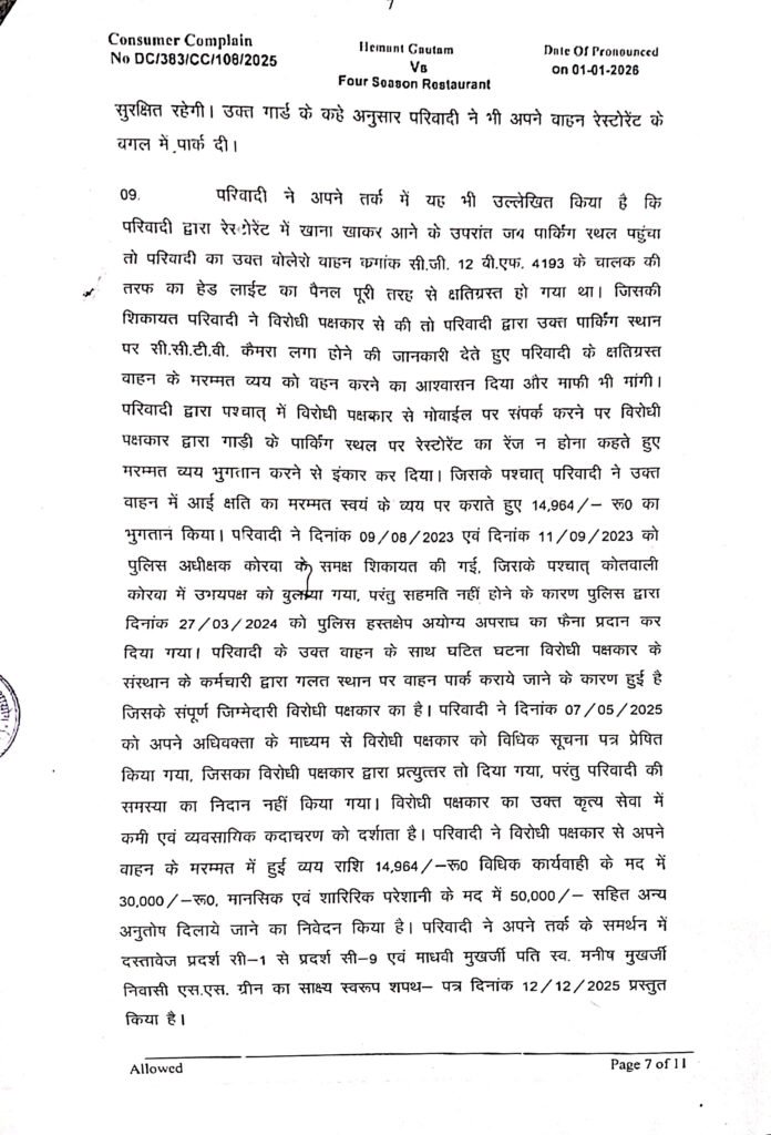 कोरबा। डिनर पर आए गेस्ट से वादे के विपरीत सेवा में कमी साबित होने पर जिला उपभोक्ता विवाद प्रतितोष आयोग कोरबा ने होटल फोर सीजन द रेस्टोरेंट पर 17 हजार का जुर्माना लगाया है। होटल द्वारा बताई गई पार्किंग पर खड़ी की गई गाड़ी की हैडलाइट क्षतिग्रस्त हो गई थी। रेस्टोरेंट संचालक ने पहले मरम्मत खर्च देने का वादा किया पर बाद में मुकर गया।