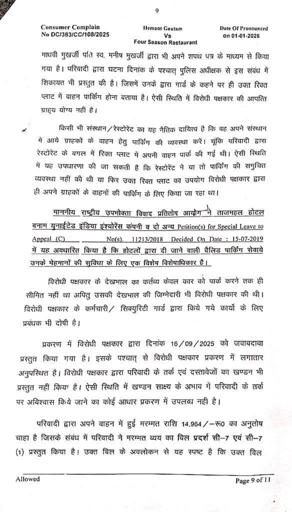 पर जब डिनर के बाद परिवादी वापस जाने रेस्टोरेंट से पार्किंग पर पहुंचे तो पाया कि उनके वाहन में ड्राईवर के तरफ की हेड लाईट तक पैनल पूरी तरह से क्षतिग्रस्त था। इसकी शिकायत होटल संचालक से की गई, तब उन्होंने कहा कि उक्त पार्किंग स्थान पर सीसीटीवी कैमरा लगा है। होटल संचालक ने श्री गौतम क वाहन के क्षतिग्रस्त होने पर माफी मांगी और वाहन में आने वाले मरम्मत के खर्च को वहन कर करने का वादा कर रवाना कर दिया।