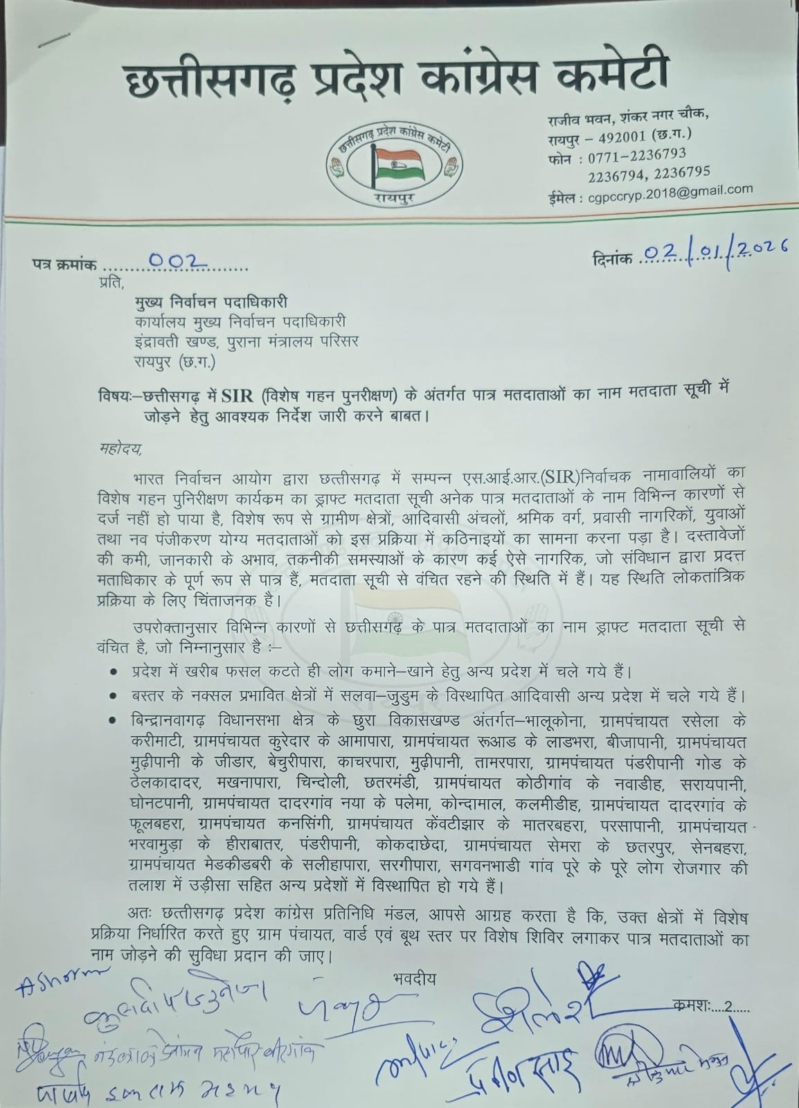 कांग्रेस ने मांग की है कि इन क्षेत्रों में ग्राम पंचायत, वार्ड और बूथ स्तर पर विशेष शिविर लगाकर पात्र मतदाताओं के नाम जोड़ने की सुविधा दी जाए।