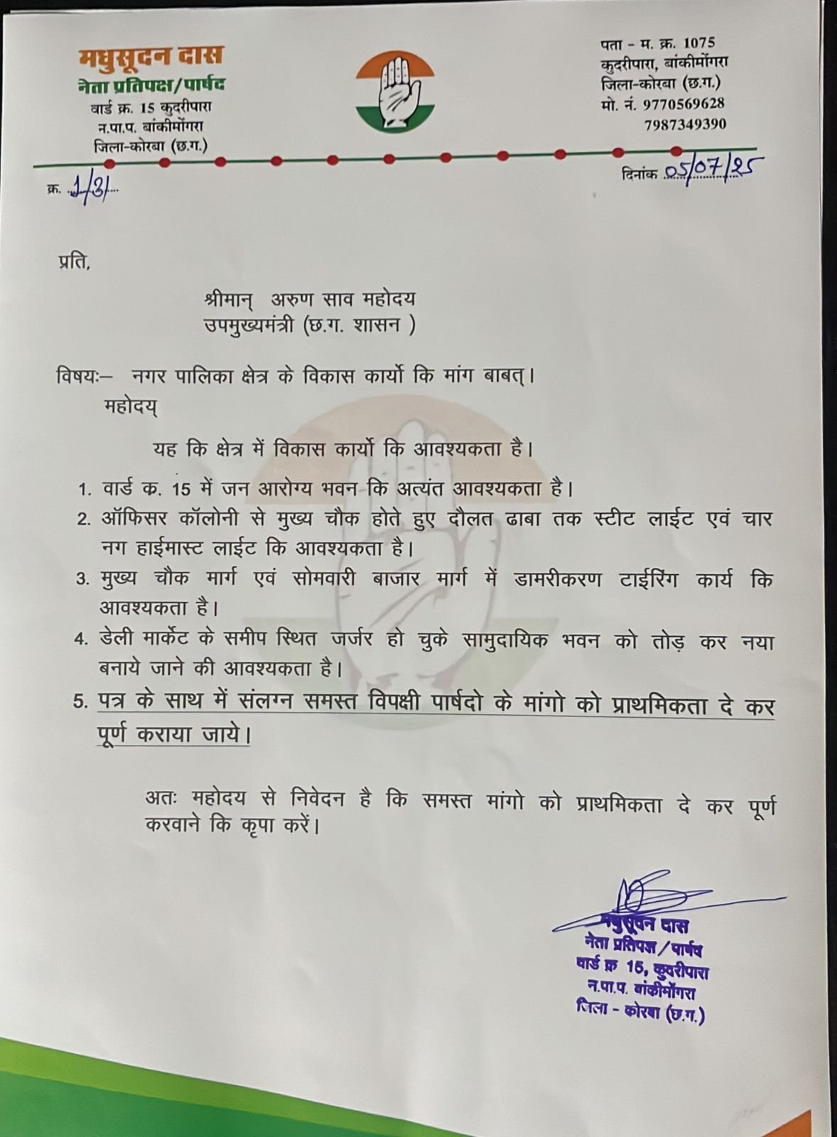 ज्ञापन की प्रतिलिपि अन्य जनप्रतिनिधियों और प्रशासनिक अधिकारियों को भी प्रेषित की गई।