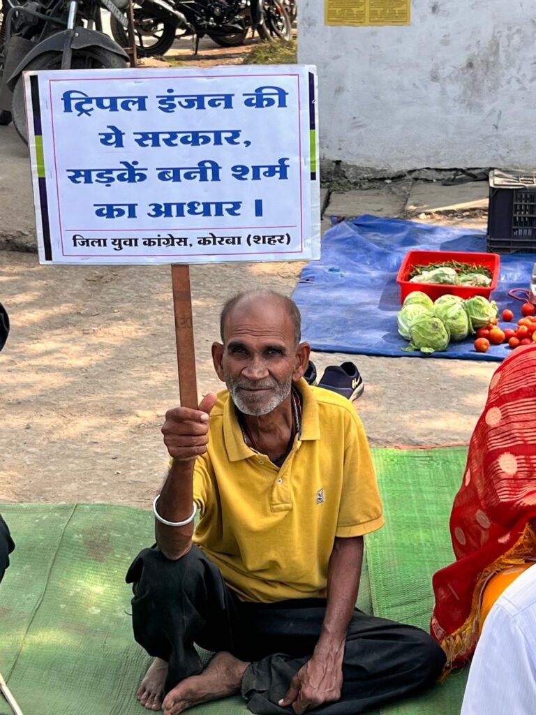 जिला युवा कांग्रेस द्वारा प्रदेश कांग्रेस सचिव विकास सिंह के नेतृत्व में भदरापारा चौक बालको पर कोरबा क्षेत्र के खराब एवं गड्ढे युक्त सड़कों को लेकर प्रदर्शन किया