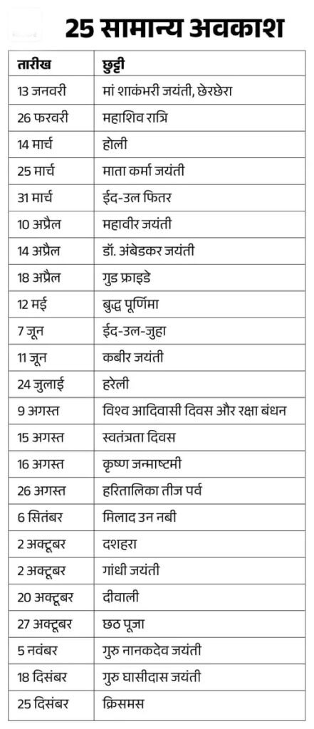 रायपुर,एजेंसी। छत्तीसगढ़ सरकार ने नए साल यानी 2025 के लिए छुट्टियों की घोषणा कर दी है। इनमें 25 सामान्य और 55 ऐच्छिक अवकाश (ऑप्शनल लीव) शामिल हैं। सरकारी कर्मचारियों को बिना काम 150 से अधिक दिनों का वेतन मिलेगा। 365 में से करीब 200 दिन ही काम करने होंगे।