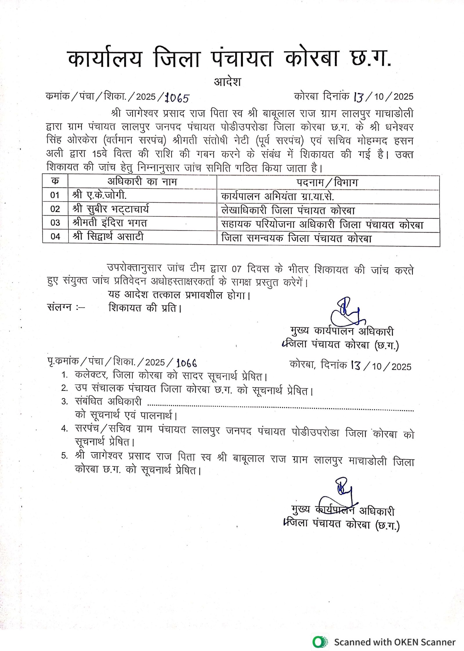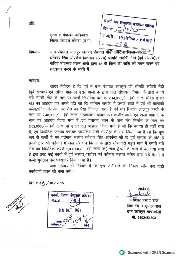 कोरबा/पोड़ी-उपरोड़ा। जिले की पोड़ी-उपरोड़ा जनपद पंचायत अंतर्गत ग्राम पंचायत लालपुर में ग्रामीणों ने जिला पंचायत सीईओ को ज्ञापन सौंपकर सरपंच, पूर्व सरपंच एवं सचिव के खिलाफ शिकायत करते हुए 15वें वित्त की राशि में 8.64 लाख रूपए के फर्जी आहरण का गंभीर आरोप लगाया है। आरोप को गंभीरता से लेते हुए जिला पंचायत सीईओ ने जांच टीम गठित कर दी है। जांच टीम में ए के जोगी (कार्यपालन अभियंता-ग्रामीण यांत्रिकी सेवा संभाग कोरबा), सुबीर भ_ाचार्य (लेखाधिकारी-जिला पंचायत कोरबा), श्रीमती इंदिरा भगत (सहायक परियोजना अधिकारी-जिला पंचायत कोरबा) एवं सिद्धार्थ असाटी (जिला समन्वयक-जिला पंचायत कोरबा) को शामिल किया गया है।