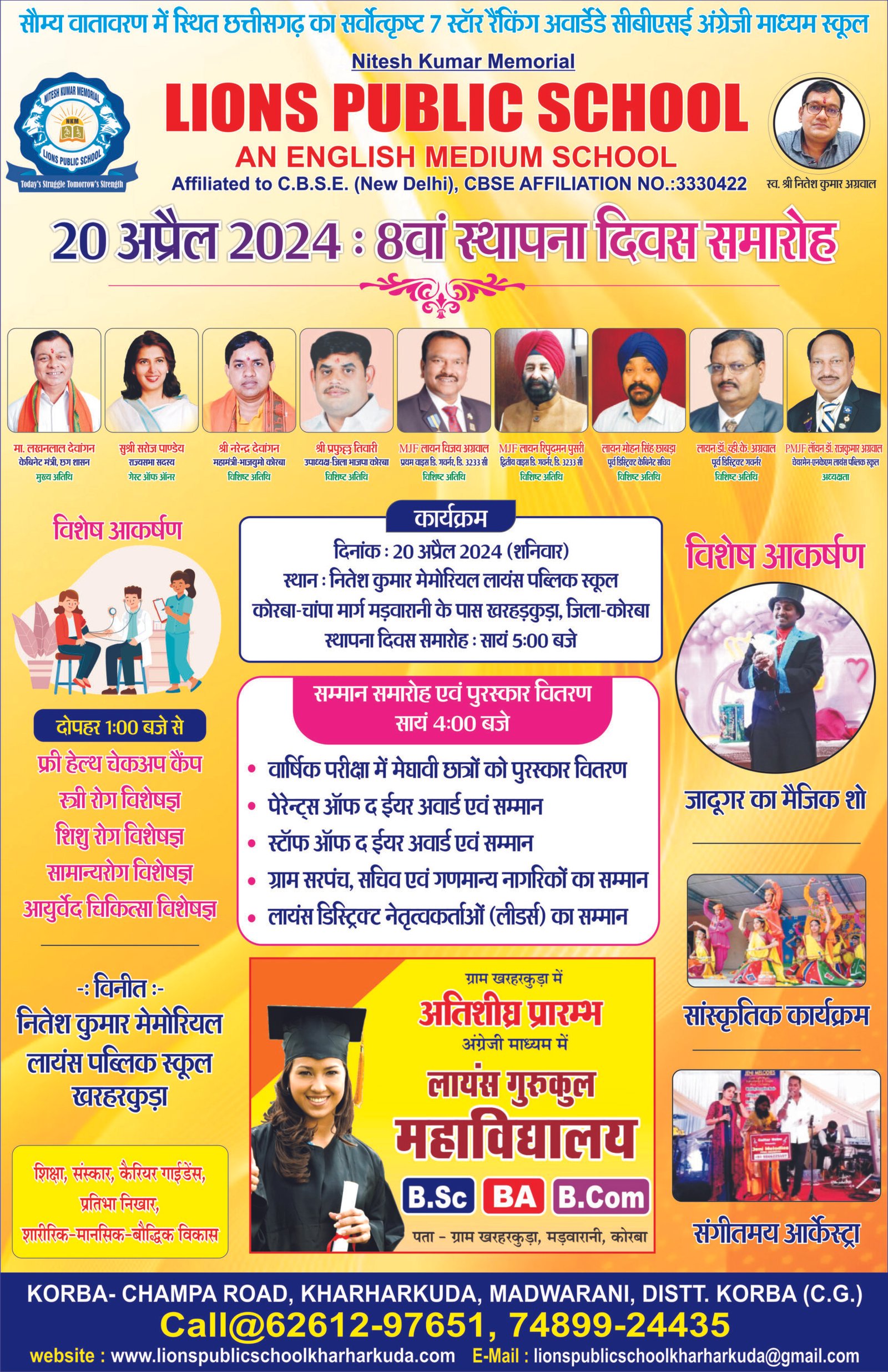 20 अप्रैल को नितेश कुमार मेमोरियल लायंस पब्लिक स्कूल अपनी विकास यात्रा का 8 साल पूरा करने जा रहा है। प्रबंधन स्थापना दिवस समारोह के लिए कोरबा के प्रथम भाजपा विधायक एवं प्रदेश के केबिनेट मंत्री लखनलाल देवांगन, राज्य सभा सांसद सुश्री सरोज पांडेय, जिला भाजपा उपाध्यक्ष प्रफुल्ल तिवारी, पार्षद नरेंद्र देवांगन सहित लायनवाद के कई दिग्गज शामिल होंगे। स्थापना दिवस समारोह में प्रतिभावान बच्चों का सम्मान, क्षेत्र के नागरिकों का सम्मान, लायनवाद के विभूतियों का सम्मान भी किया जाएगा। कार्यक्रम को रोचक बनाने के लिए सांस्कृतिक संध्या का भी आयोजन किया जाएगा। विद्यालय के चेयरमेन लायन राजकुमार अग्रवाल ने विद्यालय के विद्यार्थियों, अध्यापकगणों, शिक्षकगणों, क्षेत्र के नागरिकों सहित समारोह के अतिथियों को सादर आमंत्रित किया है, ताकि विद्यालय का गौरव बढ़ सके और बच्चों को आगे बढऩे की प्रेरणा मिल सके।