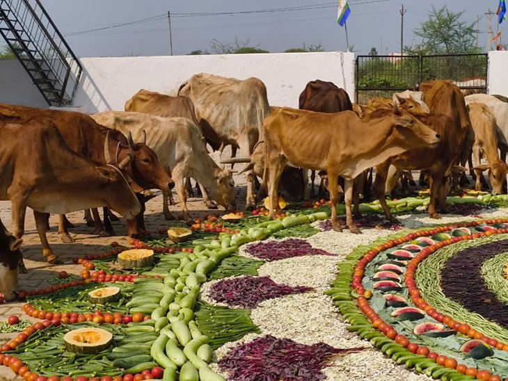 गौ-सेवक ने गायों को दी बर्थ-डे पार्टी, VIDEO:खैरागढ़ में 2000 किलो सब्जी-फलों को रंगोली की तरह सजाया; फिर 200 गायों को खिलाया