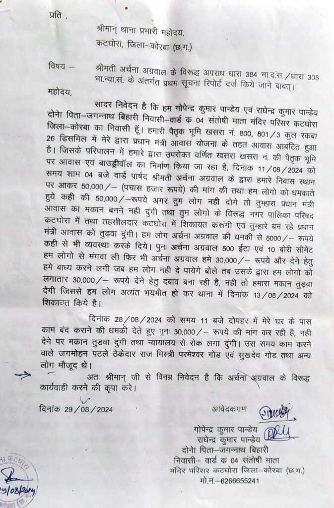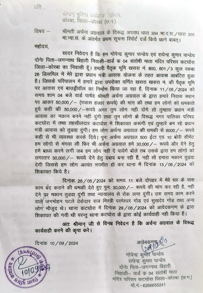 श्री पाण्डेय ने कहा कि तहसीलदार कटघोरा द्वारा स्टे हटाने के बाद श्रीमती अग्रवाल ने नगर पालिका कटघोरा में जनप्रतिनिधि हूं, कहकर नगर पालिका की तरफ से फिर से बेजा कब्जा कहकर तहसील ऑफिस में फिर से शिकायत कर दी है। एक बार तहसीलदार द्वारा स्टे हटाने के बाद अर्चना अग्रवाल द्वारा मुझे प्रताड़ित किया जा रहा है। श्री पाण्डेय का आरोप है कि मेरे भाई राघवेन्द्र कुमार पाण्डेय ने श्रीमती अग्रवाल को एक ट्रैक्टर ईंट, 10 बोरी सीमेंट हैसियत के अनुसार दिया था, लेकिन जबतक 50 हजार नहीं दोगे, मैं तुम लोगों को छोड़ूंगी नहीं, कहकर बार-बार शिकायत कर रही हैं, जिसके कारण मैं मेरा परिवार, बूढ़े माता-पिता मानसिक रूप से प्रताड़ित हैं। श्री पाण्डेय ने कहा कि श्रीमती अर्चना अग्रवाल की धमकी से हम भयभीत और डरे हुए हैं।