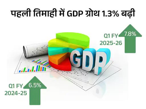 मुंबई,एजेंसी। वित्त वर्ष 2025-26 की पहली तिमाही (अप्रैल-जून) में भारत की GDP ग्रोथ सालाना आधार पर 6.5% से बढ़कर 7.8% पर पहुंच गई है। ये पिछली 5 तिमाही में सबसे ज्यादा है।