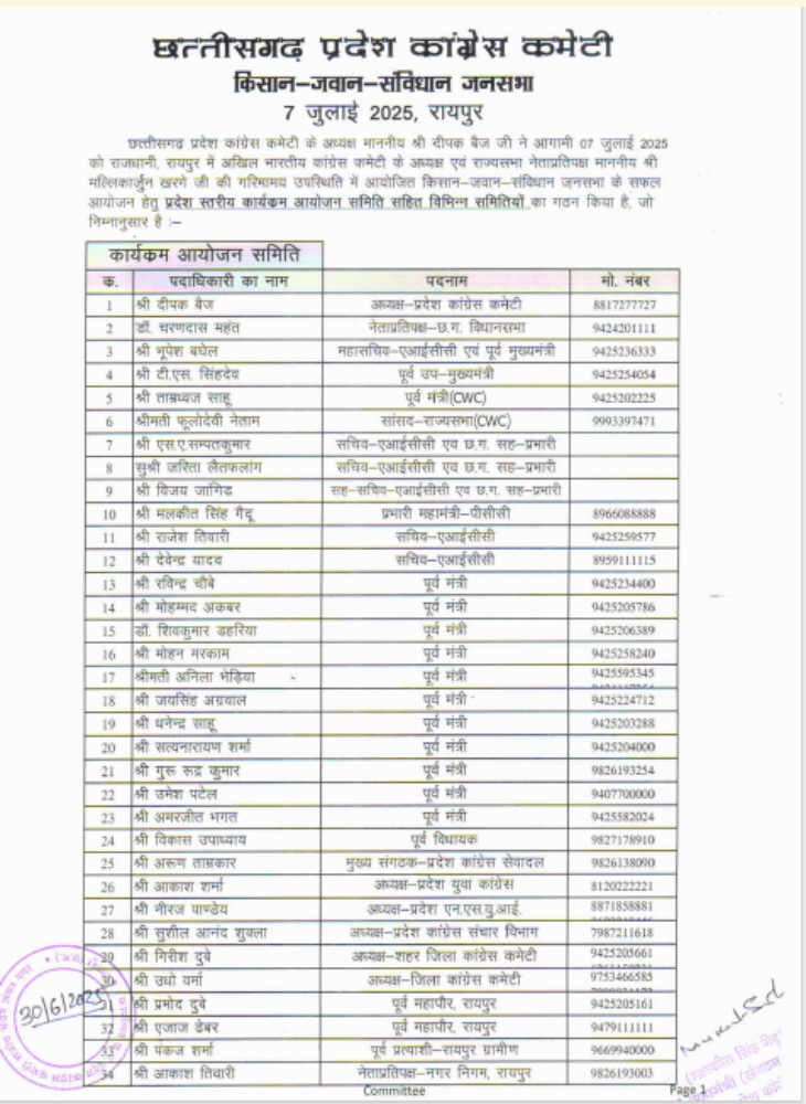 इसजनसभा को लेकर सोमवार रात पीसीसी अध्यक्ष दीपक बैज ने प्रदेश स्तरीय कार्यक्रम आयोजन समिति समेत 9 अलग-अलग समितियों का गठन किया है।