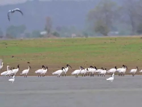 तांदुला बांध के किनारे आईबिस पक्षी।