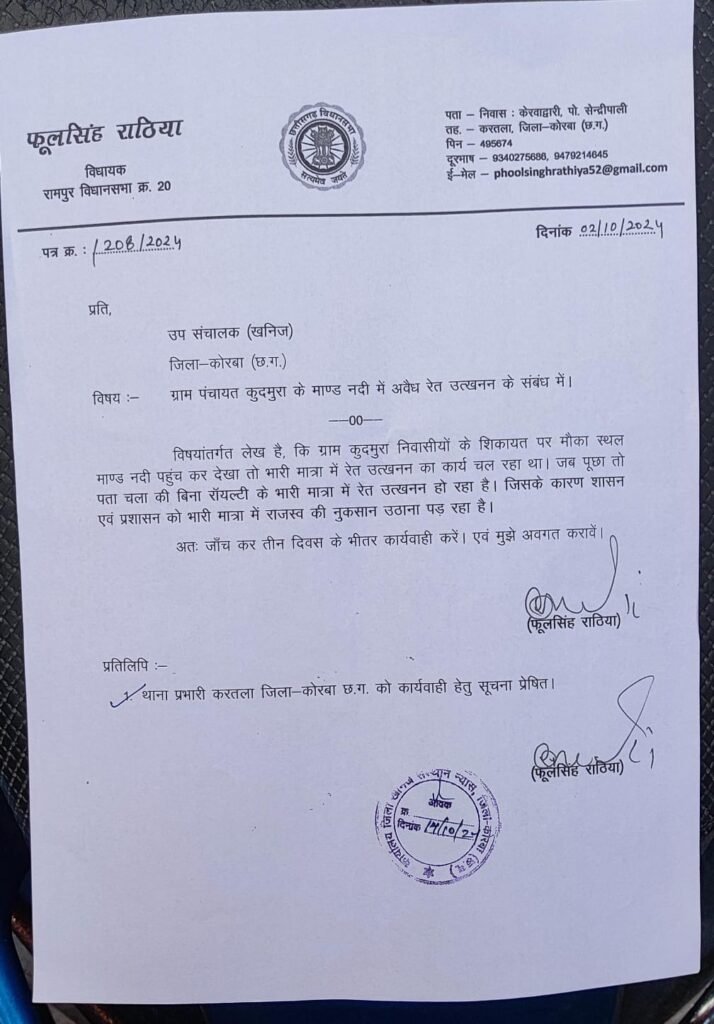 विधायक फूलसिंह राठिया ने उप संचालक खनिज को कार्रवाई करने लिखा पत्र