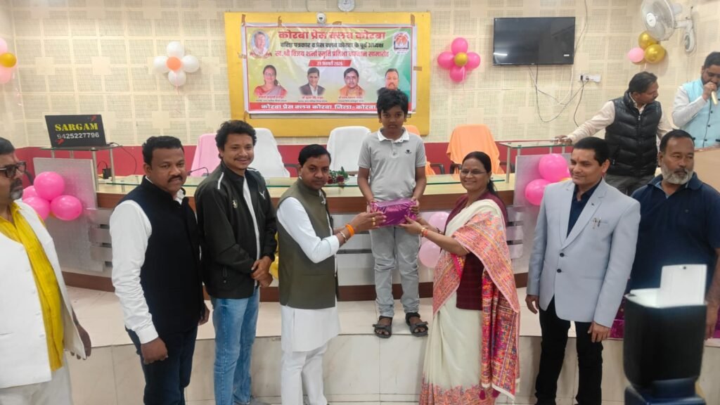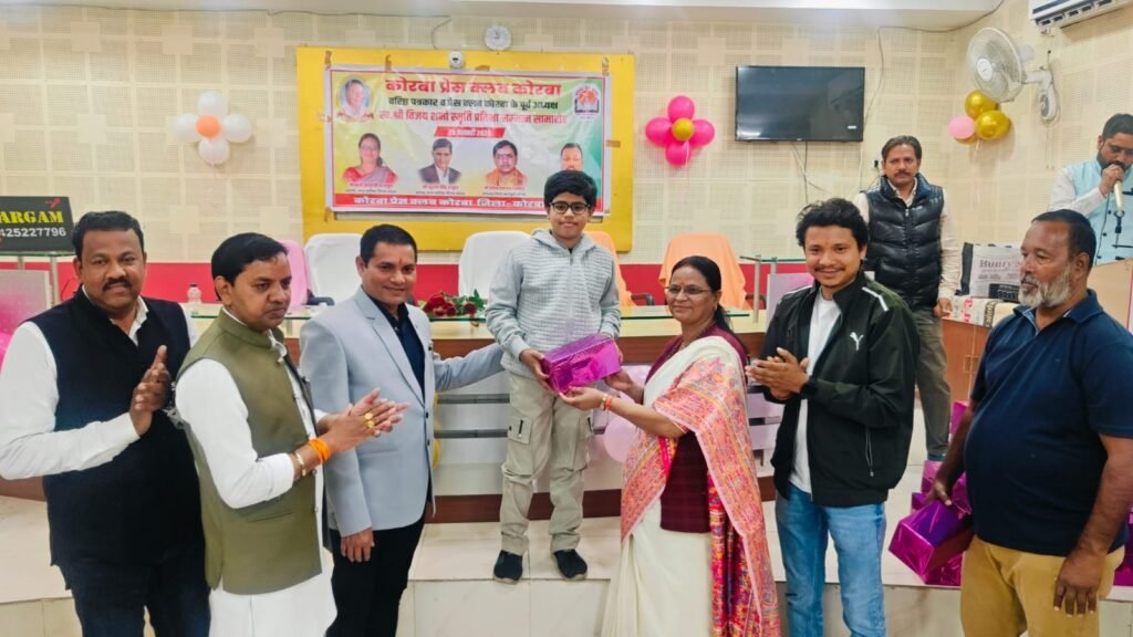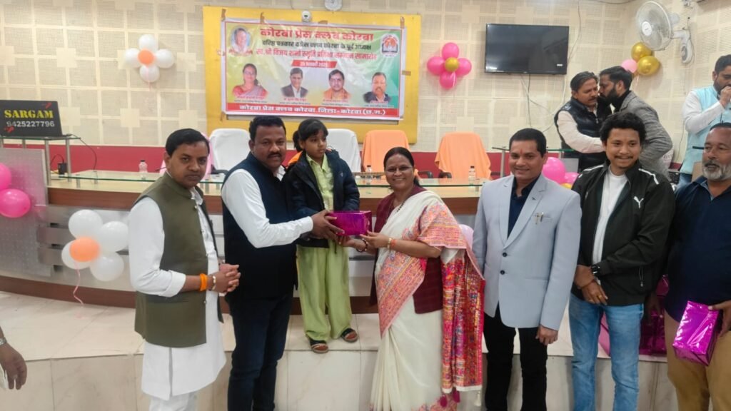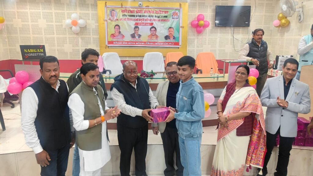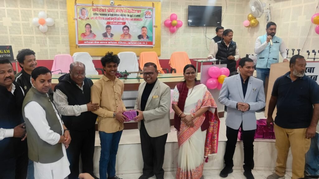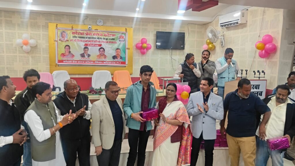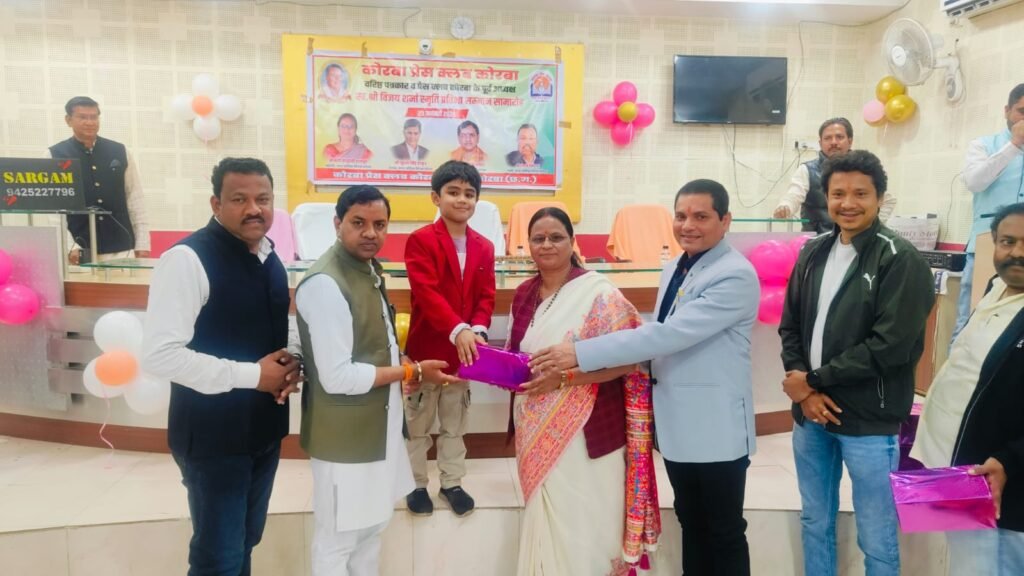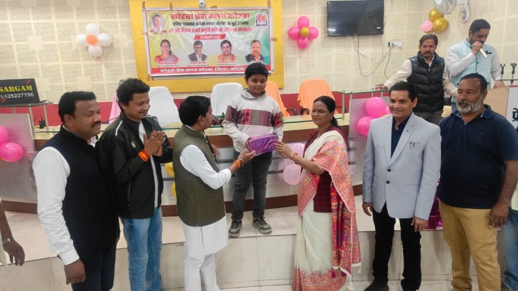 यह बातें शुक्रवार 23 जनवरी 2026 को कोरबा प्रेस क्लब तिलक भवन में आयोजित प्रतिभावान बच्चों के सम्मान समारोह में बतौर मुख्य अतिथि मौजूद रहीं नगर पालिक निगम कोरबा की महापौर श्रीमती संजू देवी राजपूत ने कहीं। वरिष्ठ पत्रकार एवं कोरबा प्रेस क्लब के पूर्व अध्यक्ष स्व.श्री विजय शर्मा की स्मृति में प्रतिभा सम्मान समारोह आयोजित किया गया था। वसंत पंचमी के शुभ अवसर पर आयोजित कार्यक्रम में कोरबा प्रेस क्लब के सदस्य परिवार समेत सम्मिलित हुए और होनहार बच्चों को सम्मानित एवं पुरस्कृत किया गया। समारोह में कार्यक्रम की अध्यक्षता कर रहे नगर निगम के सभापति नूतन सिंह ठाकुर, दूसरी बार निर्विरोध पार्षद एवं भाजयुमो उपाध्यक्ष नरेंद्र देवांगन, पार्षद पंकज देवांगन, पार्षद मुकुंद सिंह कंवर मंच पर उपस्थित रहे और प्रतिभावान बच्चों को सम्मानित किया।