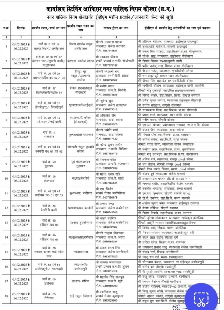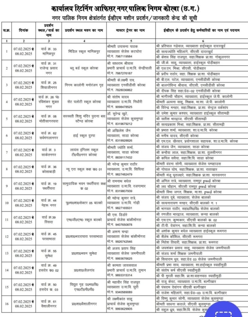 कोरबा। कलेक्टर एवं जिला निर्वाचन अधिकारी अजीत वसंत के निर्देशानुसार शहर के वार्डो में नगरीय निकाय निर्वाचन में ईवीएम के संचालन के संबंध में आमनागरिको को जागरूक किया जायेगा। वार्ड में लगने वाले शिविर में आम नागरिकों की शंकाओं / जिज्ञासाओं का निराकरण करने हेतु प्रति वार्ड (शासकीय कार्यालय में) ई.व्ही.एम. प्रदर्शन / जानकारी केन्द्र बनाया गया है। इस हेतु Demonstration Plan तैयार कर 5 से 8 फरवरी तक कर्मचारियों की ड्यूटी लगायी गई है, जिसमें समय प्रातः 10:30 बजे से सायं 5:00 बजे तक निर्धारित दिवस / स्थल में ई.व्ही.एम. का प्रचार प्रसार करना सुनिश्चित करने के निर्देश संबंधित कर्मचारियों को दिए गये हैं।