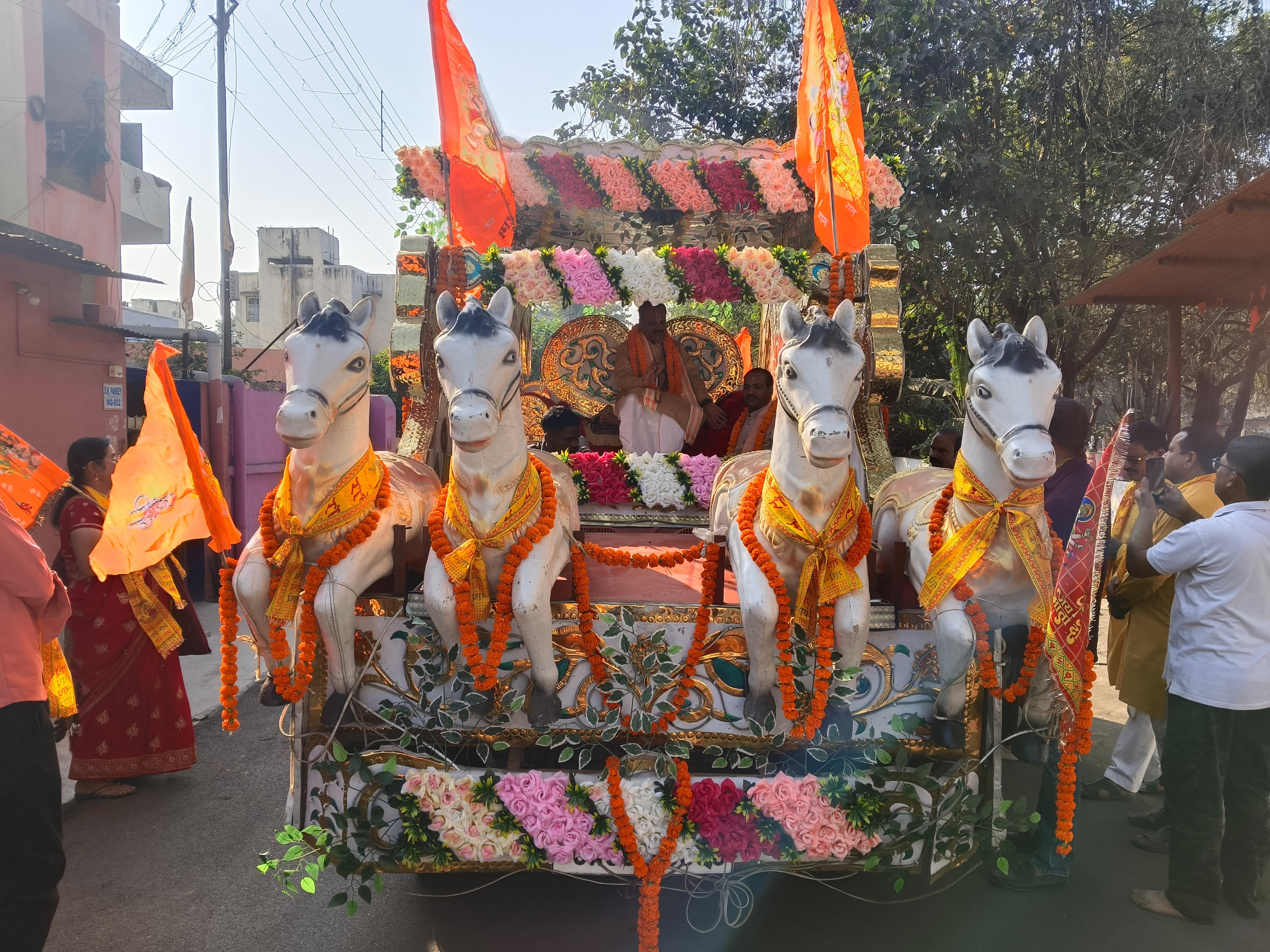 शोभायात्रा में कर्मा नाचा नृत्य दल और ढोल-नगाड़ों की गूंज सुनाई दी। श्रीधाम वृंदावन से पधारे अंतरराष्ट्रीय कथा व्यास डॉ. श्यामसुंदर पाराशर जी महाराज भी इसमें उपस्थित रहे। महिलाएं, युवतियां और अन्य भक्त बड़ी संख्या में शोभायात्रा का हिस्सा बने।