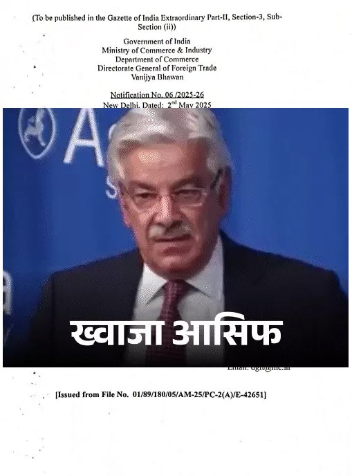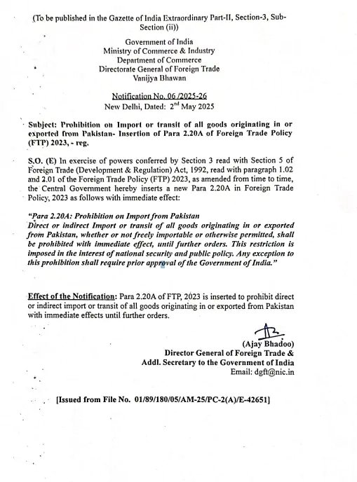 भारत ने पाकिस्तान से आने वाले सभी सामानों के आयात (इंपोर्ट) पर रोक लगा दी है। अब पाकिस्तान से सीधे या किसी और रास्ते से कोई भी चीज भारत में नहीं लाई जा सकेगी। यह फैसला देश की सुरक्षा और जनता के हित में लिया गया है। यह नियम तुरंत लागू हो गया है। सरकार ने नोटिफिकेशन जारी किया है। इसमें कहा गया कि अगर किसी को इस रोक से छूट चाहिए, तो उसे पहले भारत सरकार से इजाजत लेनी होगी।