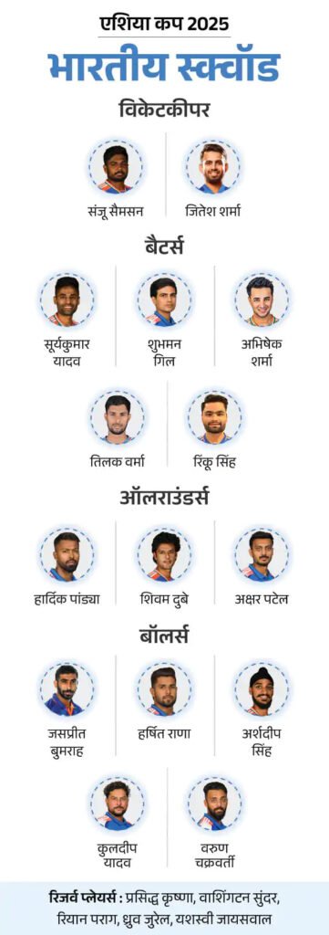 एशिया कप के लिए भारतीय क्रिकेट टीम का ऐलान:सूर्यकुमार कप्तान, गिल उपकप्तान; जायसवाल-सुंदर रिजर्व प्लेयर, टूर्नामेंट 9 सितंबर से