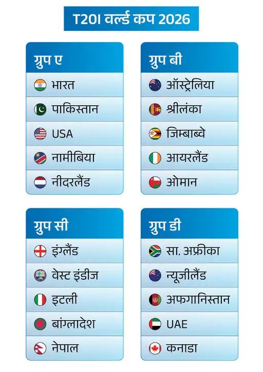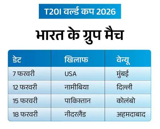 भारत अपने वर्ल्ड कप अभियान की शुरुआत 7 फरवरी को मुंबई में USA के खिलाफ करेगा। उसके बाद 12 फरवरी को नामीबिया से दिल्ली, 15 फरवरी को पाकिस्तान से कोलंबो और 18 फरवरी को नीदरलैंड से अहमदाबाद में मैच होंगे।