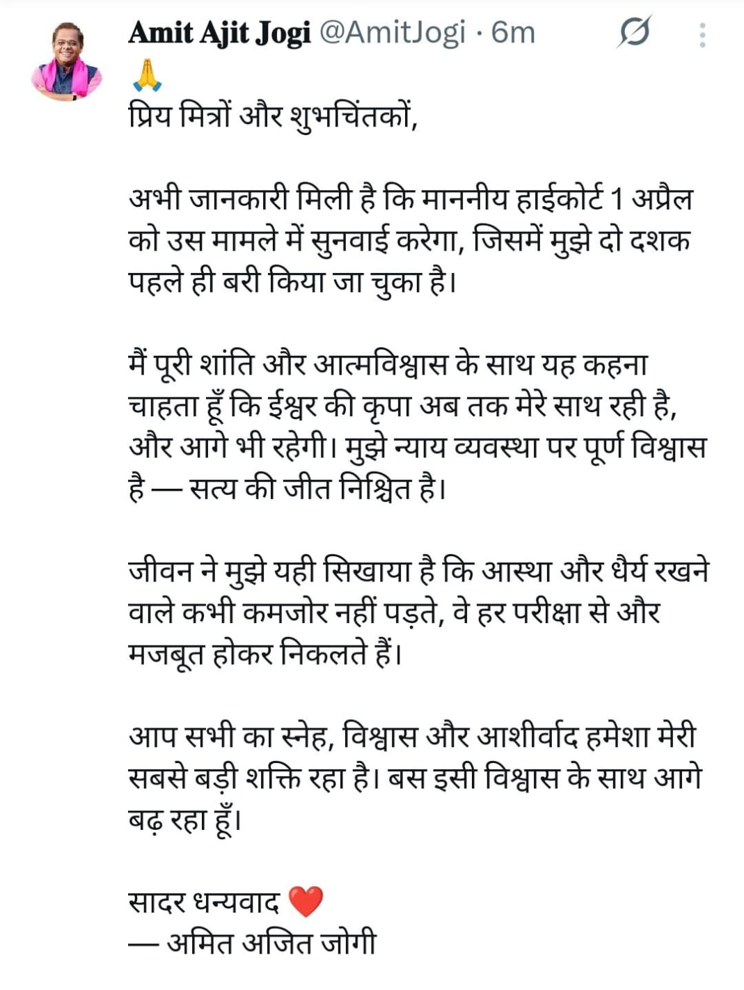 इस मामले पर अमित जोगी ने कहा कि अभी जानकारी मिली है कि हाईकोर्ट 1 अप्रैल को उस मामले में सुनवाई करेगा, जिसमें मुझे दो दशक पहले ही बरी किया जा चुका है। मैं पूरी शांति और आत्मविश्वास के साथ यह कहना चाहता हूं कि ईश्वर की कृपा अब तक मेरे साथ रही है, और आगे भी रहेगी। मुझे न्याय व्यवस्था पर पूर्ण विश्वास है- सत्य की जीत निश्चित है।