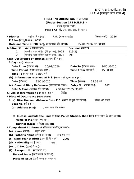 आरोपियो को अपराध क्रमांक 209/25 धारा 333, 296, 115 (2), 351(2), 3(5) पंजीबद्ध कर माननीय न्यायलय मे पेश किया गया जहा से उनको जेल दाखिल करा दिया।