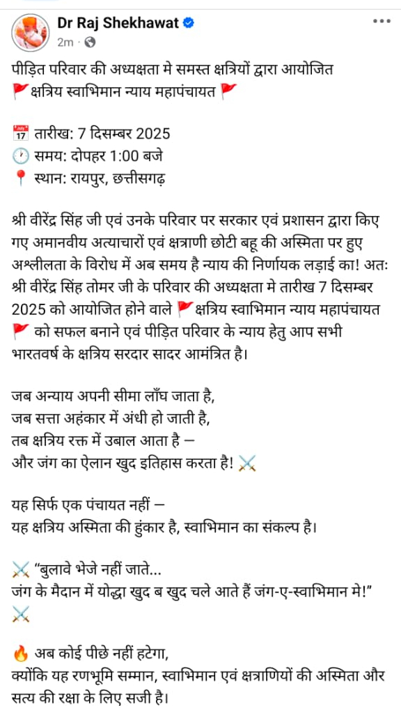राज शेखावत ने सोशल मीडिया पर पोस्ट किया है कि छत्तीसगढ़ में 7 दिसंबर को न्याय महापंचायत की जाएगी। वहीं 3 महीने पहले राजपूत करणी सेना के राष्ट्रीय अध्यक्ष महिपाल सिंह मकराना ने रायपुर में कहा था कि हिस्ट्रीशीटर वीरेंद्र सिंह तोमर का करणी सेना से कोई संबंध नहीं है।