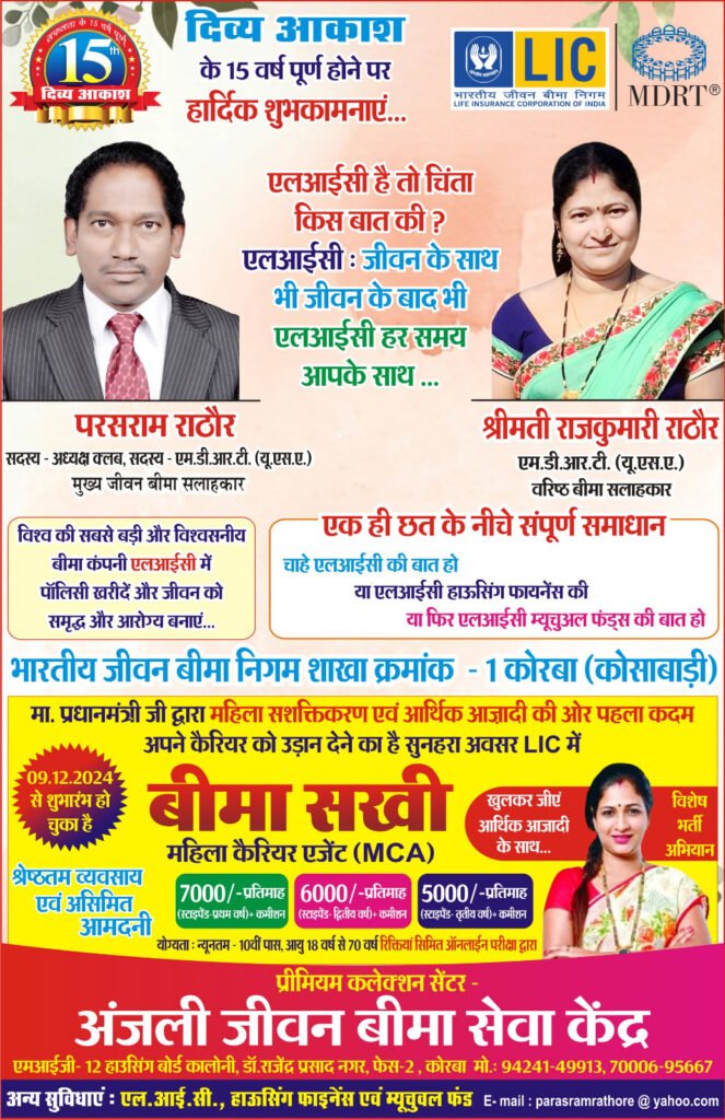 अंजलि जीवन बीमा सेवा केन्द्र में बीमा सखियों का सम्मेलन भी आयोजित किया गया, जिसमें वक्ताओं ने बीमा सखियों को बीमा करने के गुर सीखाए। अंजलि जीवन बीमा सेवा केन्द्र एमआईजी 12 हाऊसिंग बोर्ड कालोनी, डॉ राजेन्द्र प्रसाद नगर, फेस-2 कोसाबाड़ी कोरबा के संचालक परसराम राठौर ने कहा कि प्रधानमंत्री नरेंद्र मोदी द्वारा प्रारंभ की गई योजना-बीमा सखी, महिला सशक्तिकरण तथा महिलाओं को आर्थिक स्वावलंबन की दिशा में मील का पत्थर साबित हो रही है और महिलाएं-युवतियां बीमा सखी बनकर आत्म निर्भर बनने के साथ-साथ आगे बढ़ रही हैं। उन्होंने कहा कि बीते दिसंबर माह 2024 में इस योजना का शुभारंभ प्रधानमंत्री नरेंद्र मोदी ने किया था। उनके द्वारा अब तक 21 बीमा सखी एलआईसी में अपना कैरियर बना रही हैं। बीमा सखी से जुडऩे के लिए उनसे संपर्क कर सकते हैं और मोबाईल नंबर 70006-95667,94241-49913 पर संपर्क कर सकते हैं। उन्होंने बताया बीमा सखियों को 3 साल तक केन्द्र सरकार स्कालरशीप देगी एवं पॉलिसी करने पर अलग से कमीशन भी मिलेगा। दो तरफा आर्थिक सहयोग से बीमा सखियों का परिवार भी आर्थिक सम्बल की ओर चल पड़ा है।
