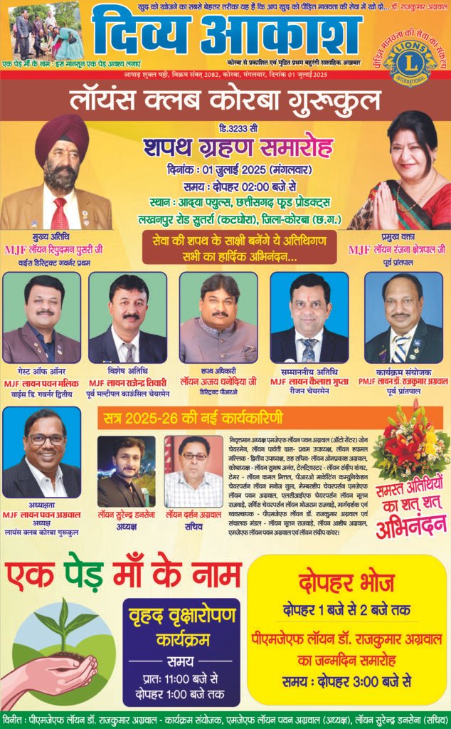 लायंस क्लब कोरबा गुरूकुल का शपथ ग्रहण कल 01 जुलाई को सुतर्रा (कटघोरा) में
